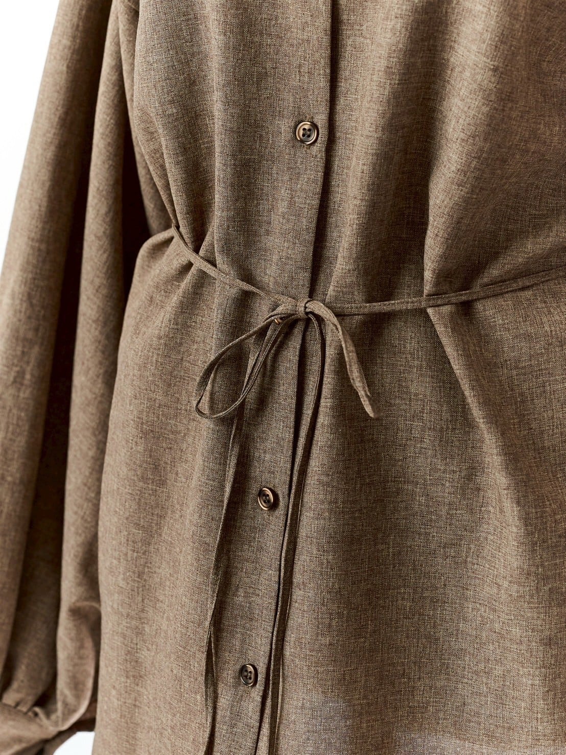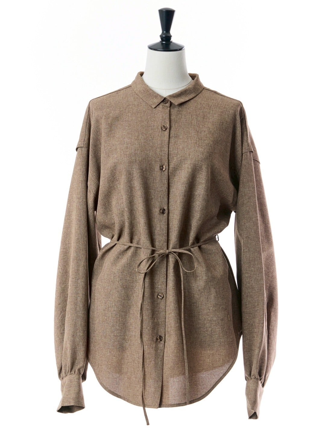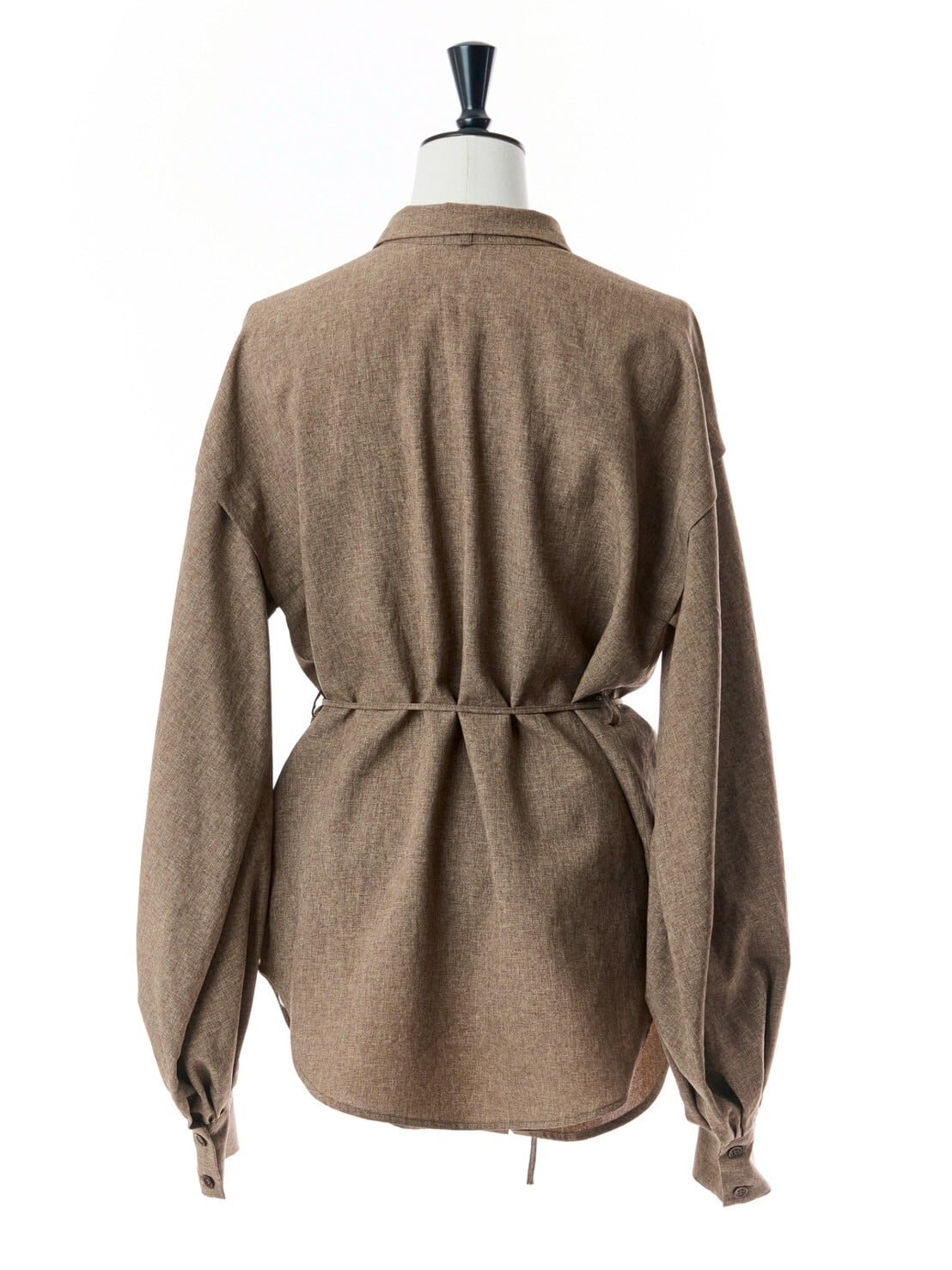 チビ襟ディティールのパフスリーブデザイン、ベルトを用いることで
