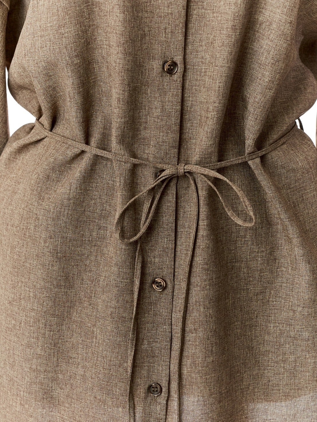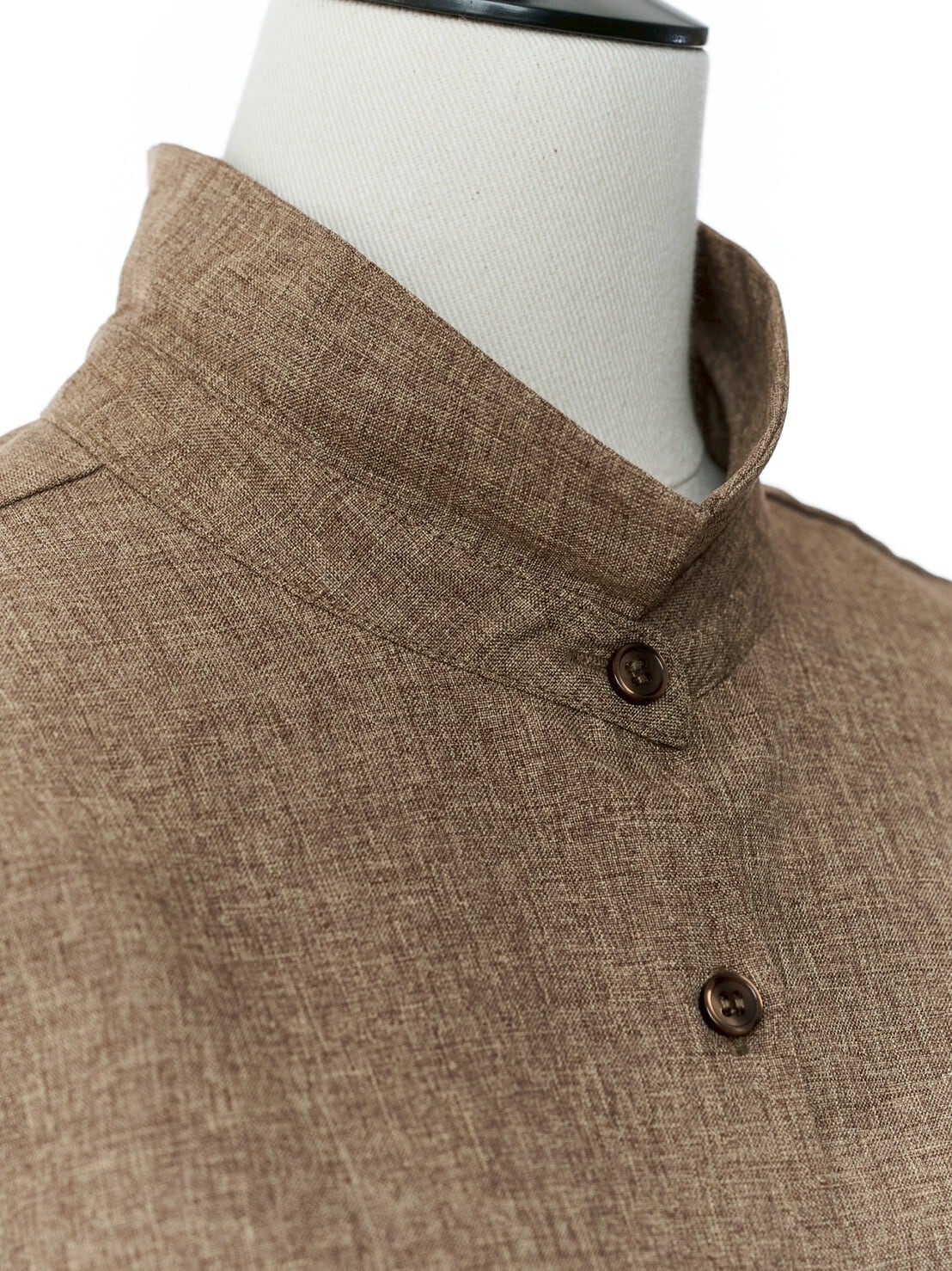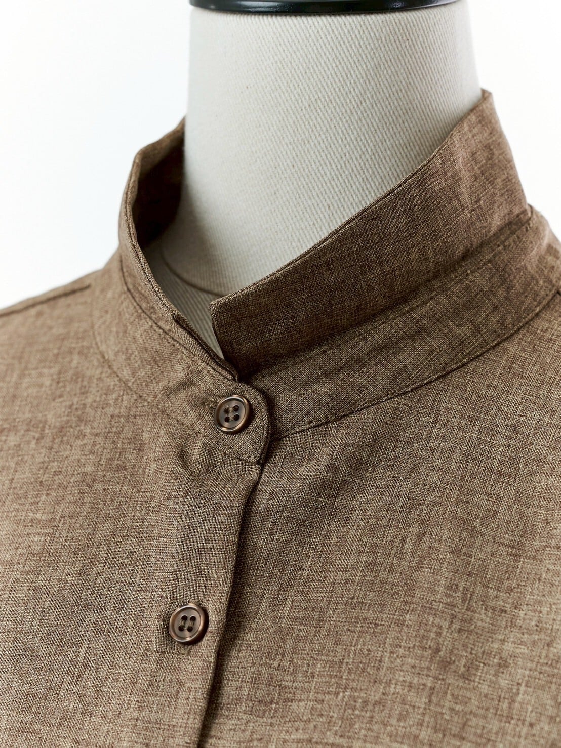 チビ襟ディティールのパフスリーブデザイン、ベルトを用いることで