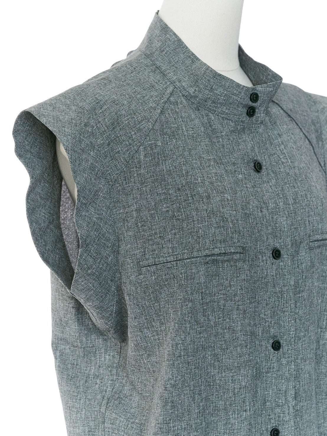 カジュアルになりすぎないよう、バンドカラー・大き目ポケットなど