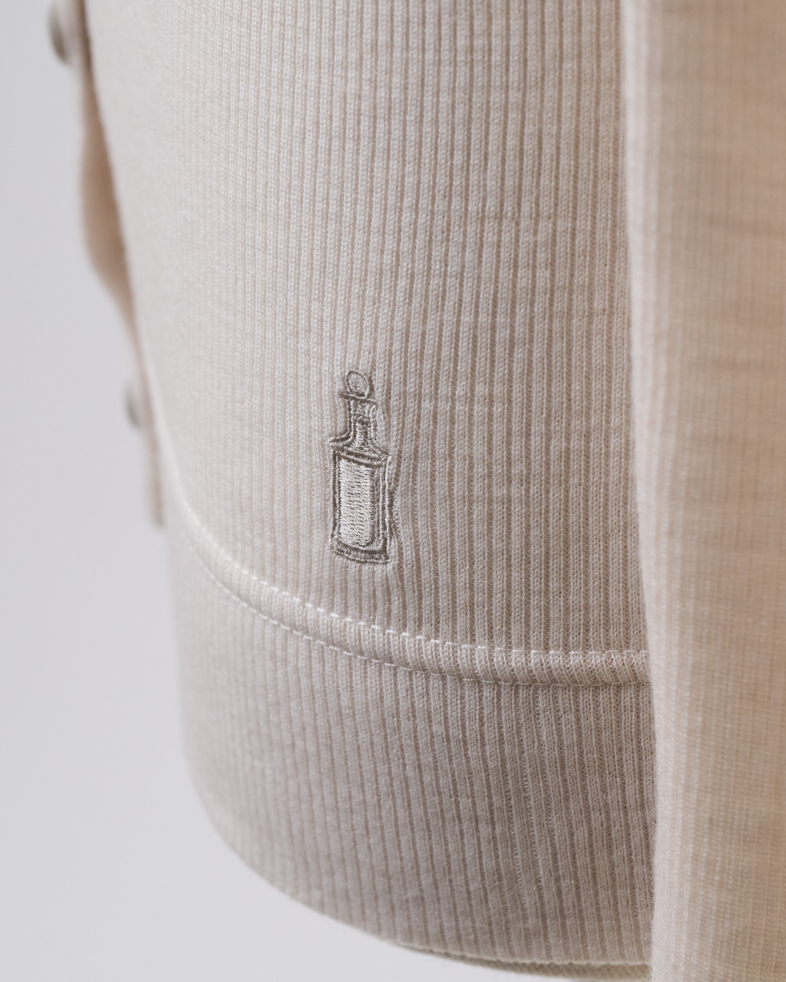身体から絶妙に離れるサイズ感で作っているのと、Vネック仕様で前開きの際も襟周りが